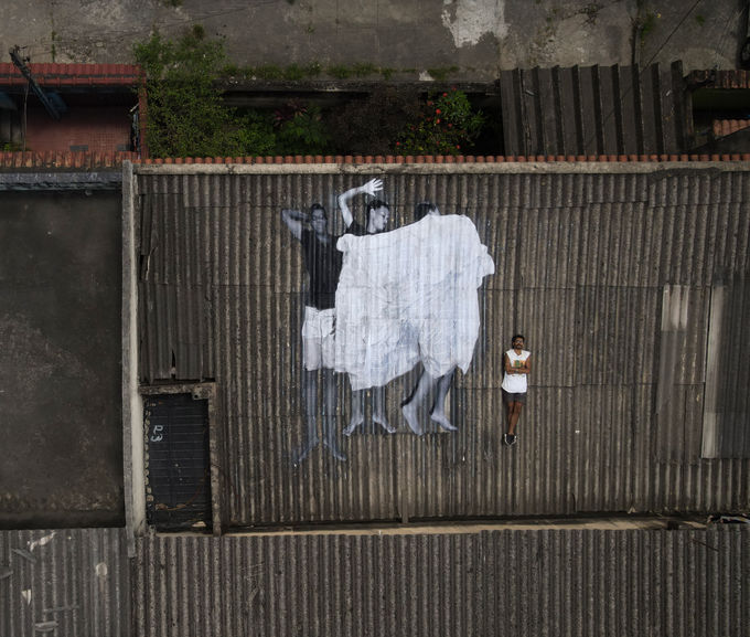 “Tecido Social” é o nome da obra desenvolvida de 30m², situada no telhado de uma residência na Vila Kennedy, zona oeste do Rio de Janeiro. O lambe-lambe assume uma dimensão simbólica que aponta diretamente para a violência e para vulnerabilidade social.